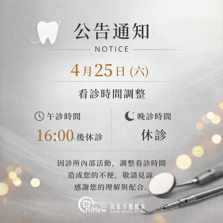 午診|看診至 16:00 晚診|暫停看診 造成您的不便,敬請見諒 也感謝您的理解與配合。 如有看診需求,建議提前預約或安排其他時段, 我們將持續為您提供專業且貼心的醫療服務。 高新牙醫體系感謝您的支持與信任
